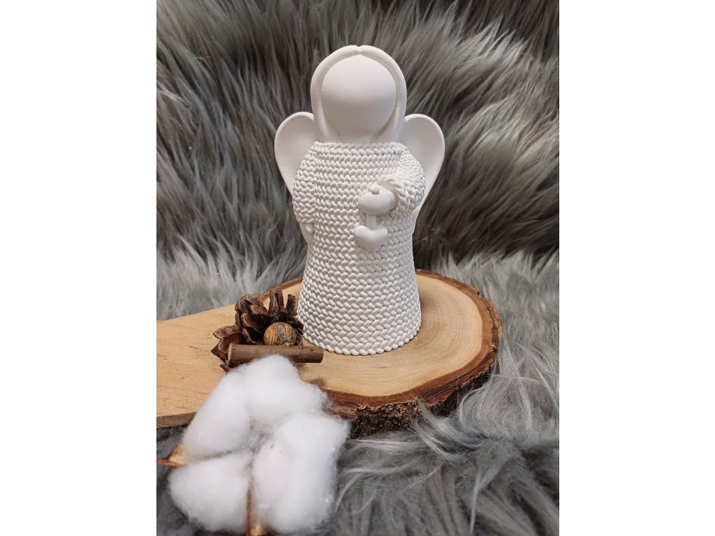 Originální dekorativní anděl vyrobený z kvalitní keraflotové hmoty. Odlitek má krásnou strukturu připomínající pletený svetr a v ruce drží drobné srdíčko – symbol pohody, klidu a něhy.