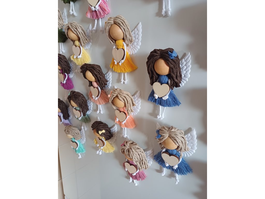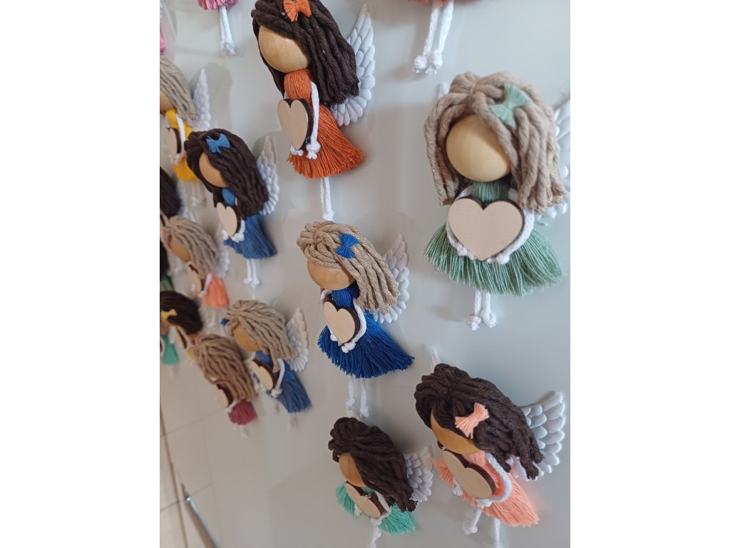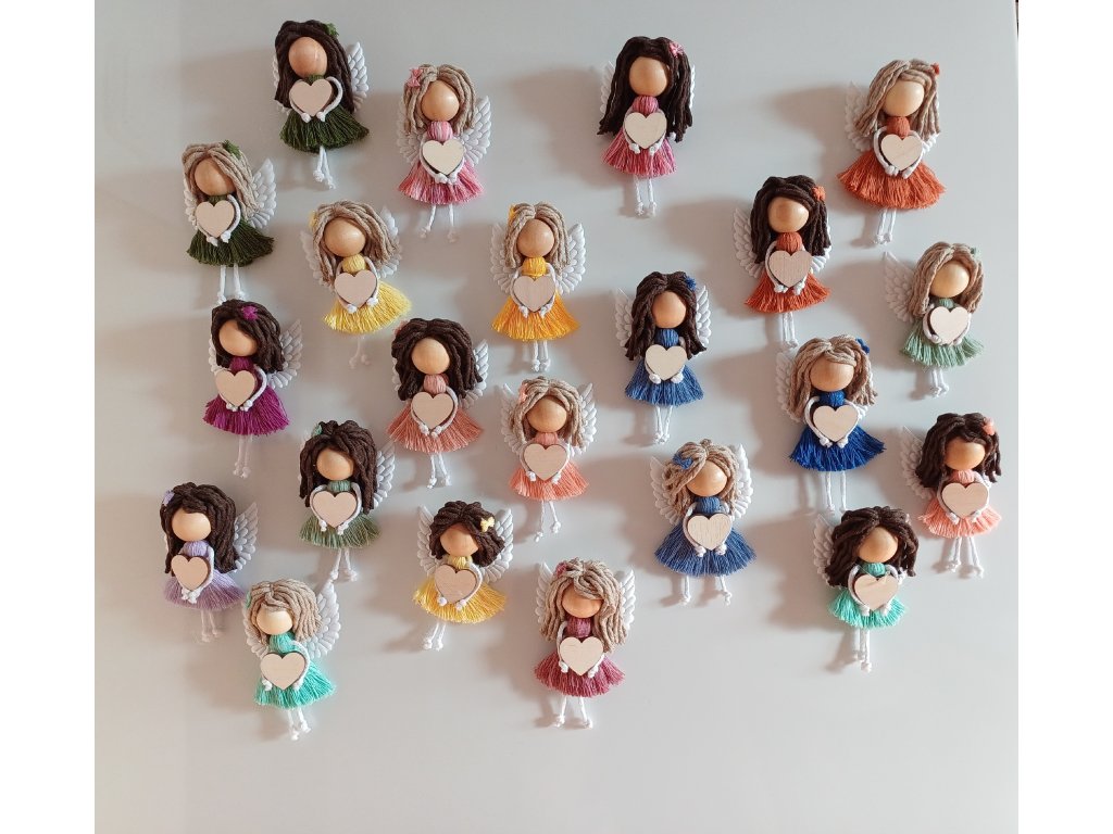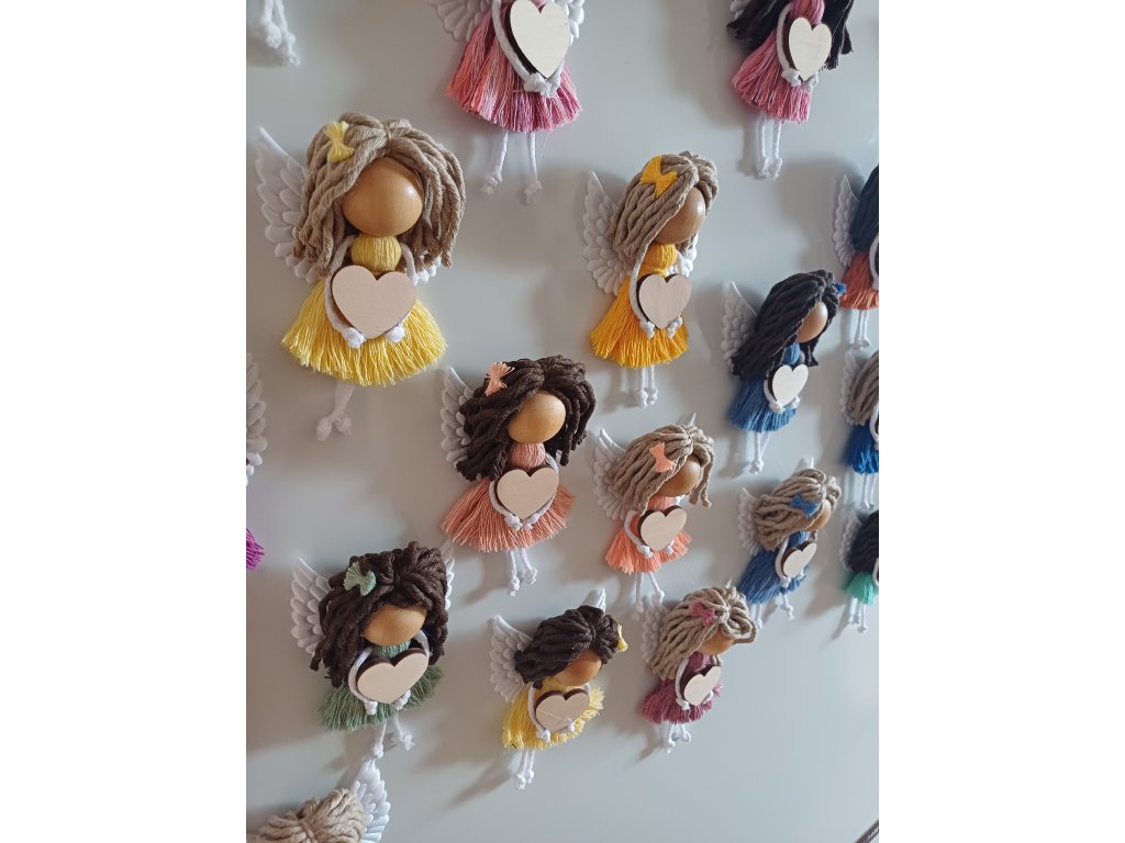 Jemná ručně vyráběná macramé andělka, která potěší jako drobný dárek i milá dekorace. Díky magnetu na zadní straně ji snadno umístíte na lednici, magnetickou tabuli nebo jiný kovový povrch.