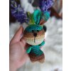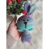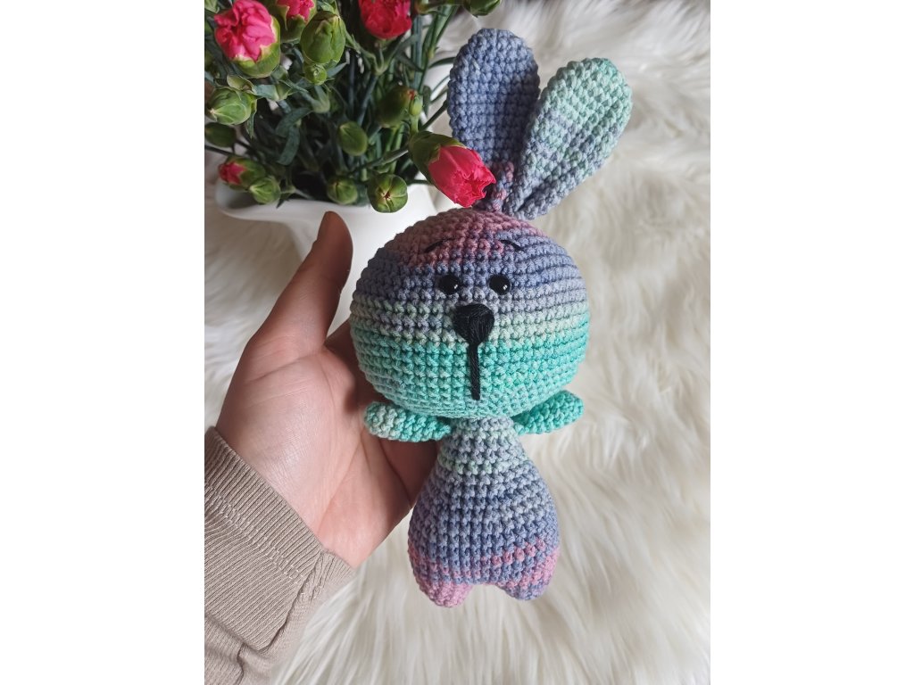 Zajíček je háčkovaný z různobarevné vzorované příze, která vytváří jemné přechody tónů.