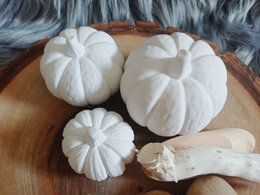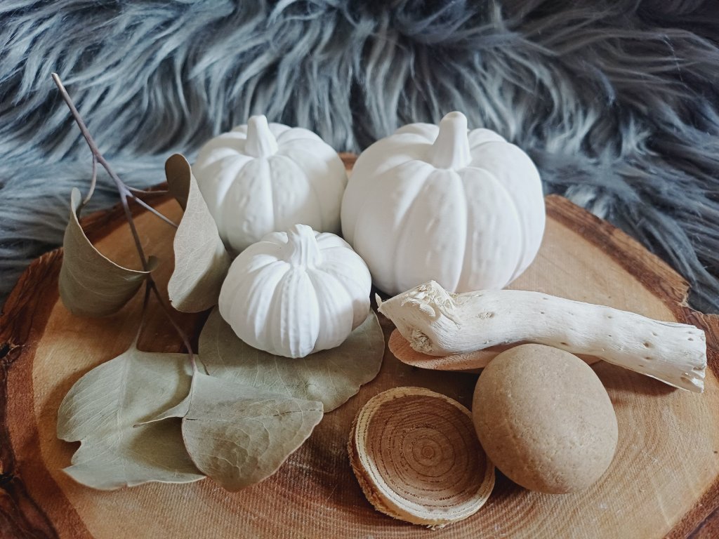 Minimalistický set ručně odlévaných dýní z keraflottu v čistě bílé barvě vnese do domova jemný a nadčasový podzimní akcent.