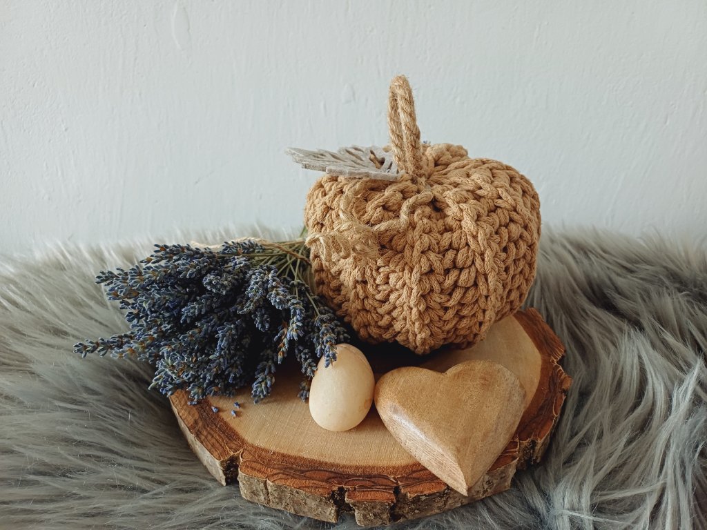 Ručně háčkované dýně jsou vyrobené z kvalitních bavlněných šňůr, které jim dodávají příjemnou strukturu a pevný tvar. Výplň je antialergenní duté vlákno.