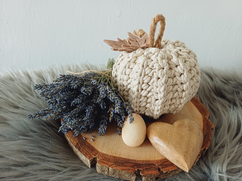 Ručně háčkované dýně jsou vyrobené z kvalitních bavlněných šňůr, které jim dodávají příjemnou strukturu a pevný tvar. Výplň je antialergenní duté vlákno.