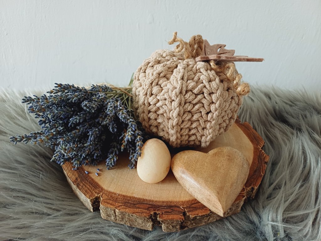 Ručně háčkované dýně jsou vyrobené z kvalitních bavlněných šňůr, které jim dodávají příjemnou strukturu a pevný tvar. Výplň je antialergenní duté vlákno.