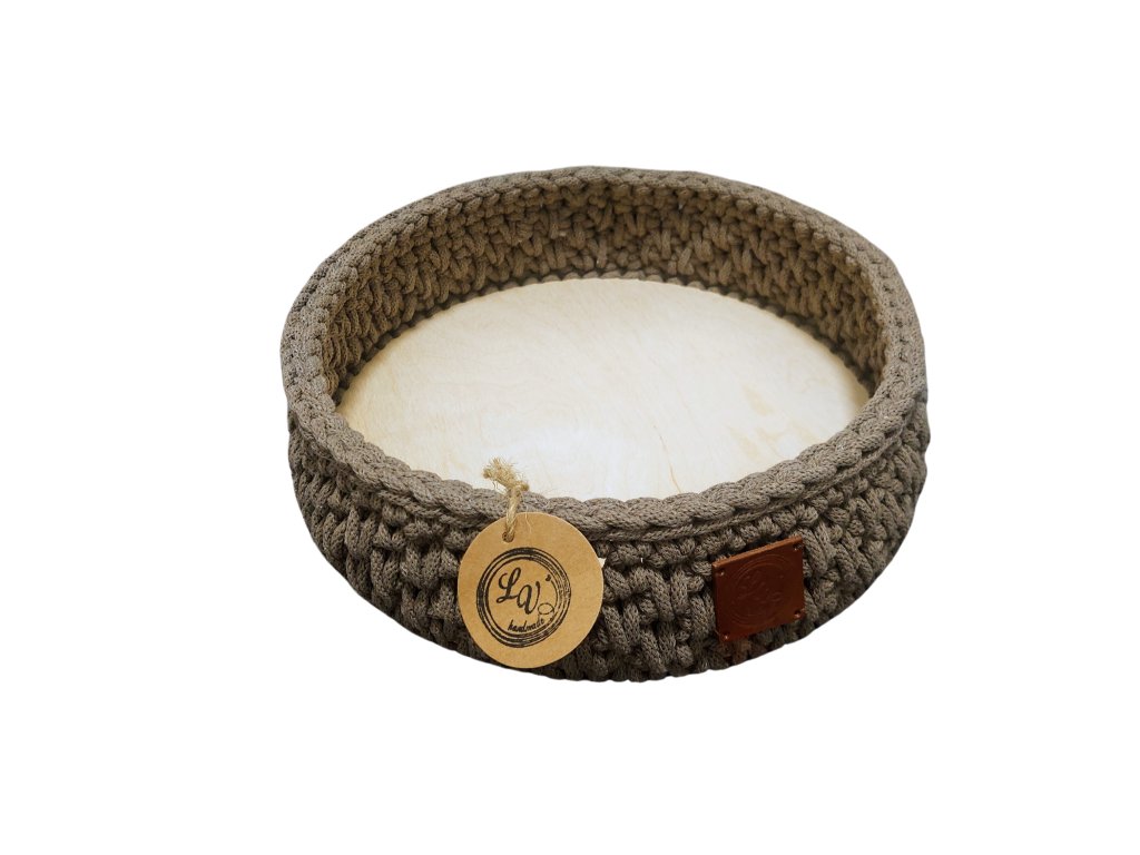 Praktický a stylový háčkovaný košík v přírodním odstínu. Díky širšímu průměru a nižší výšce je ideální pro uložení drobností, šperků nebo dekorací. Pevné dřevěné dno zajišťuje stabilitu a odolnost.