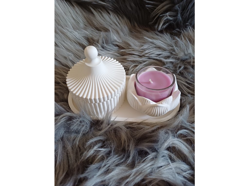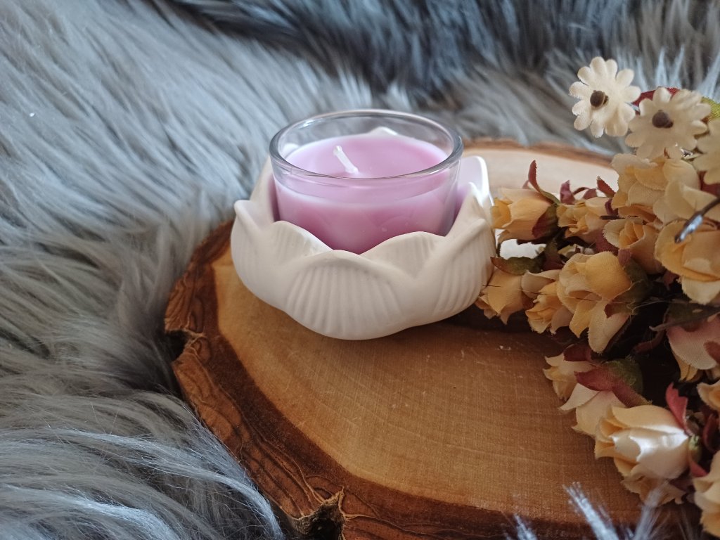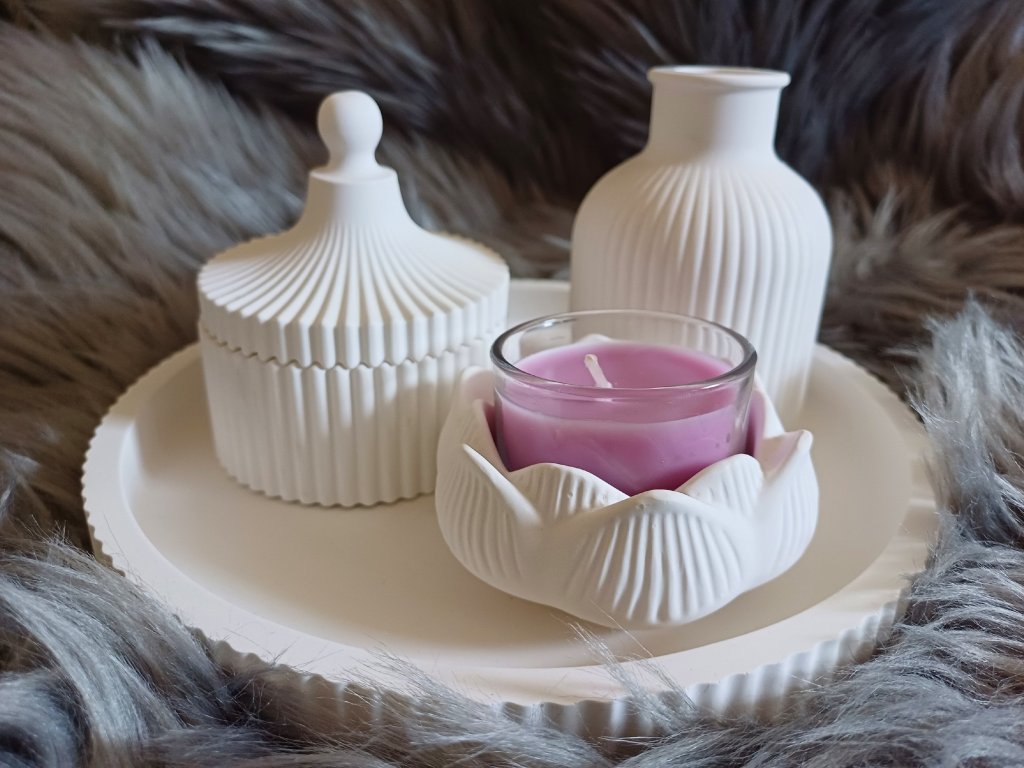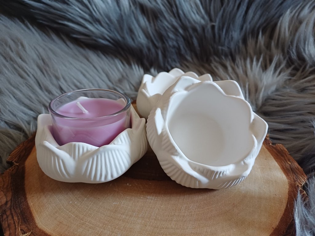 Dekorativní svícen ve tvaru lotosového květu z keraflotu. Jemné tvarování okvětních lístků vytváří elegantní a harmonický vzhled, ideální pro čajovou svíčku nebo menší skleněnou svíčku.