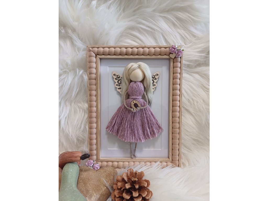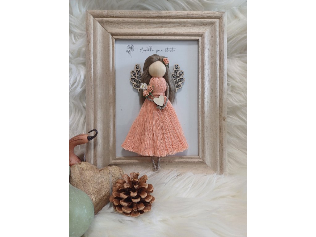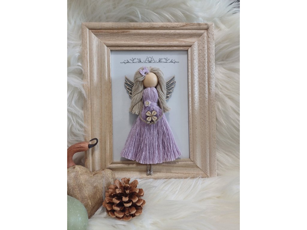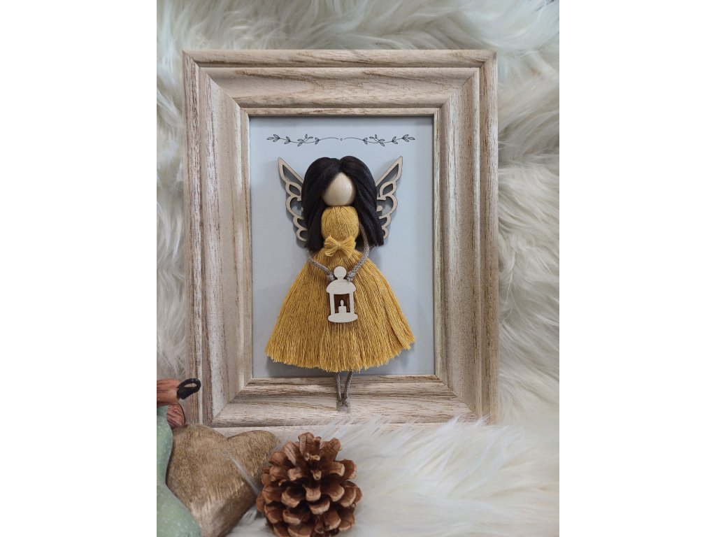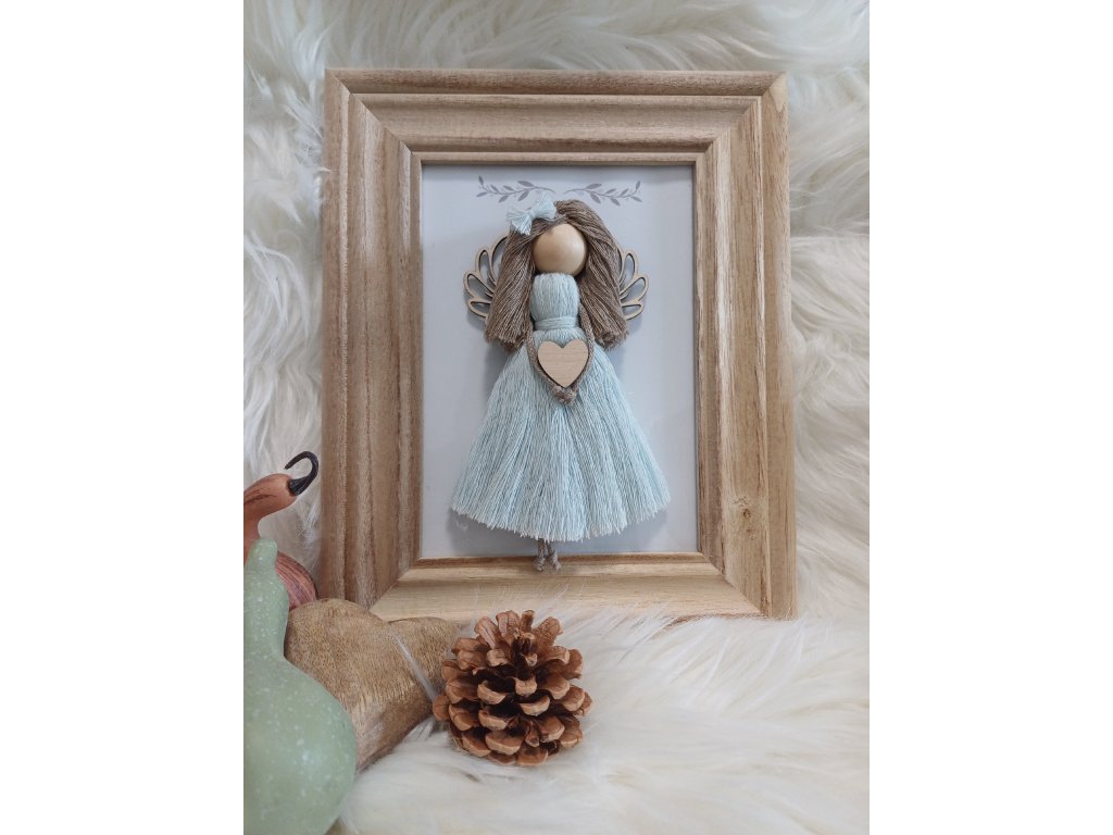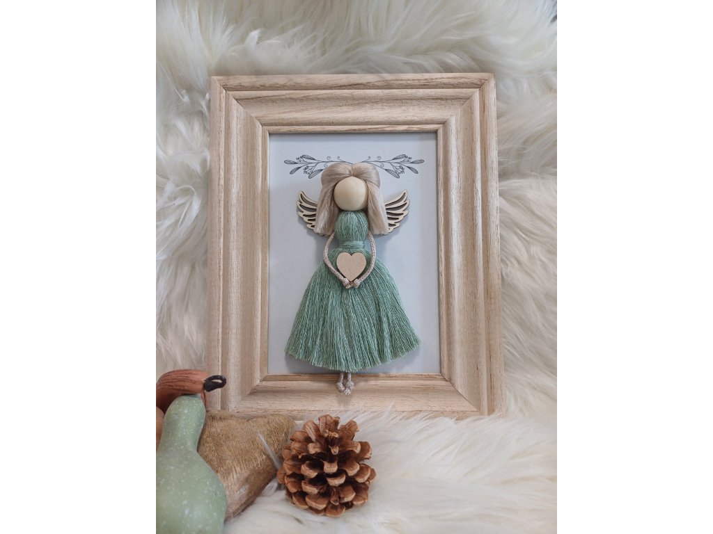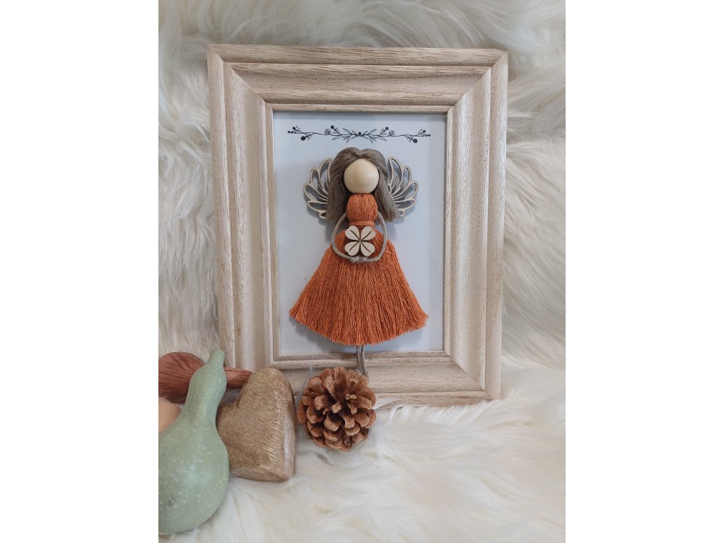 Ručně tvořený macramé anděl v dřevěném rámečku je jemnou dekorací s přírodním nádechem. Kombinace bavlněné příze a dřevěných detailů dodává celku harmonický vzhled.