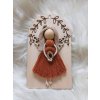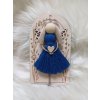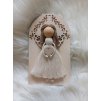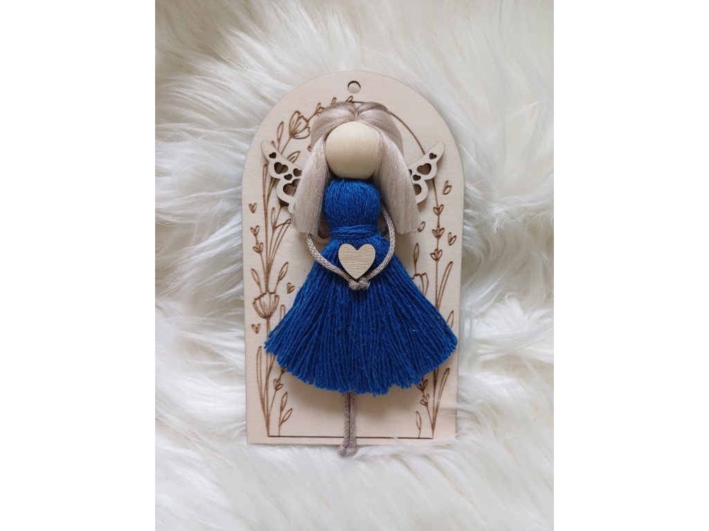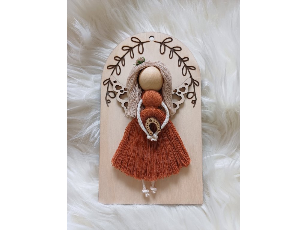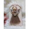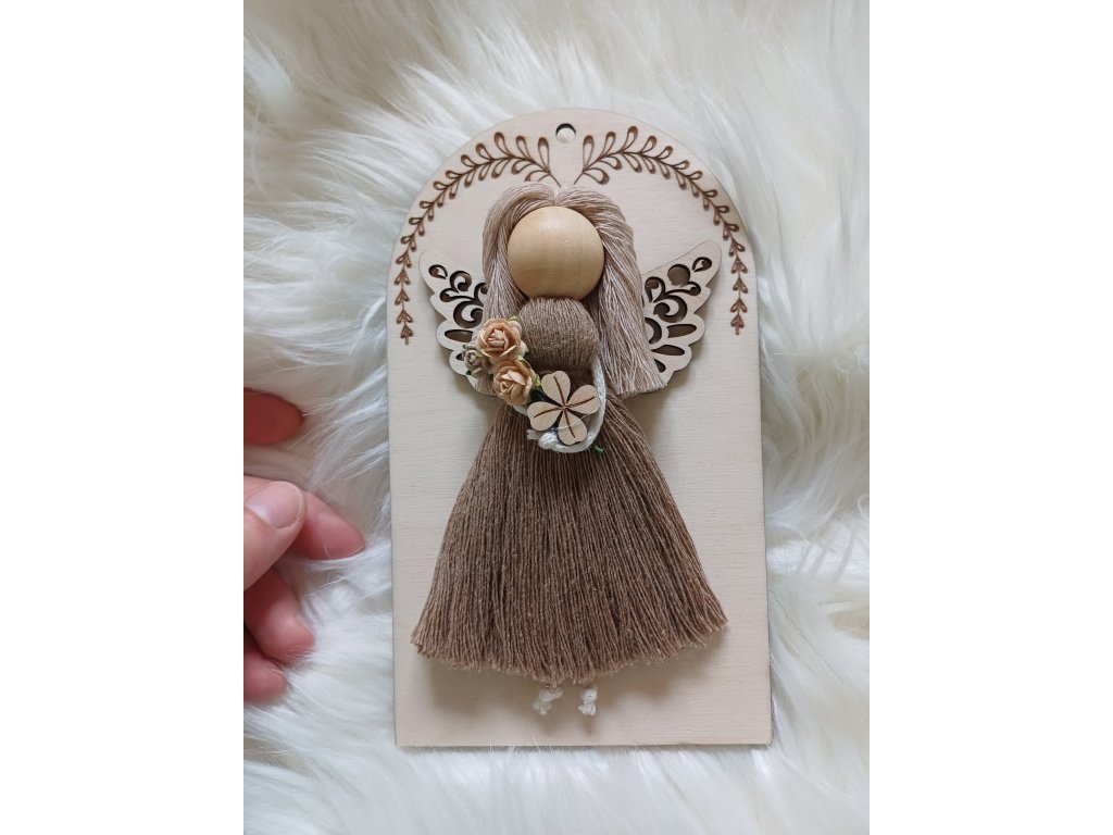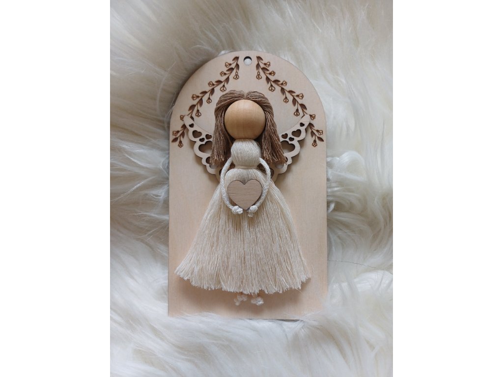 Macrame andělka je připevněná na dřevěném podkladu s gravírovaným květinovým vzorem, takže se hodí k postavení i zavěšení.