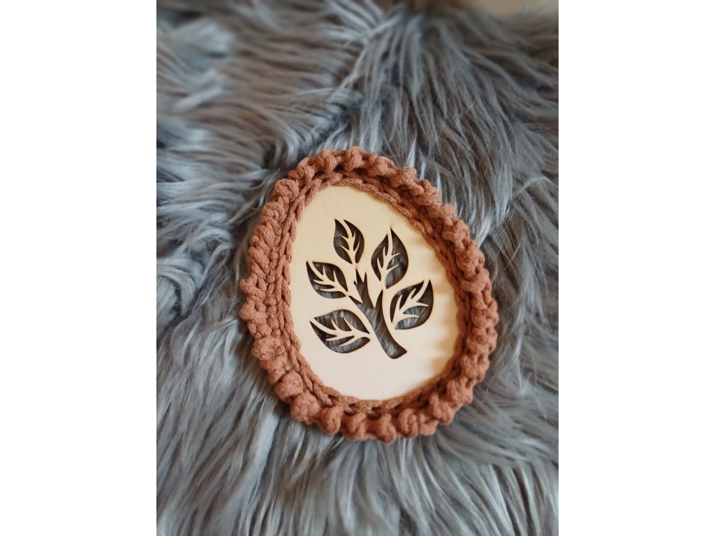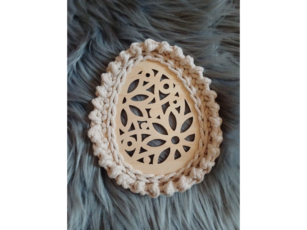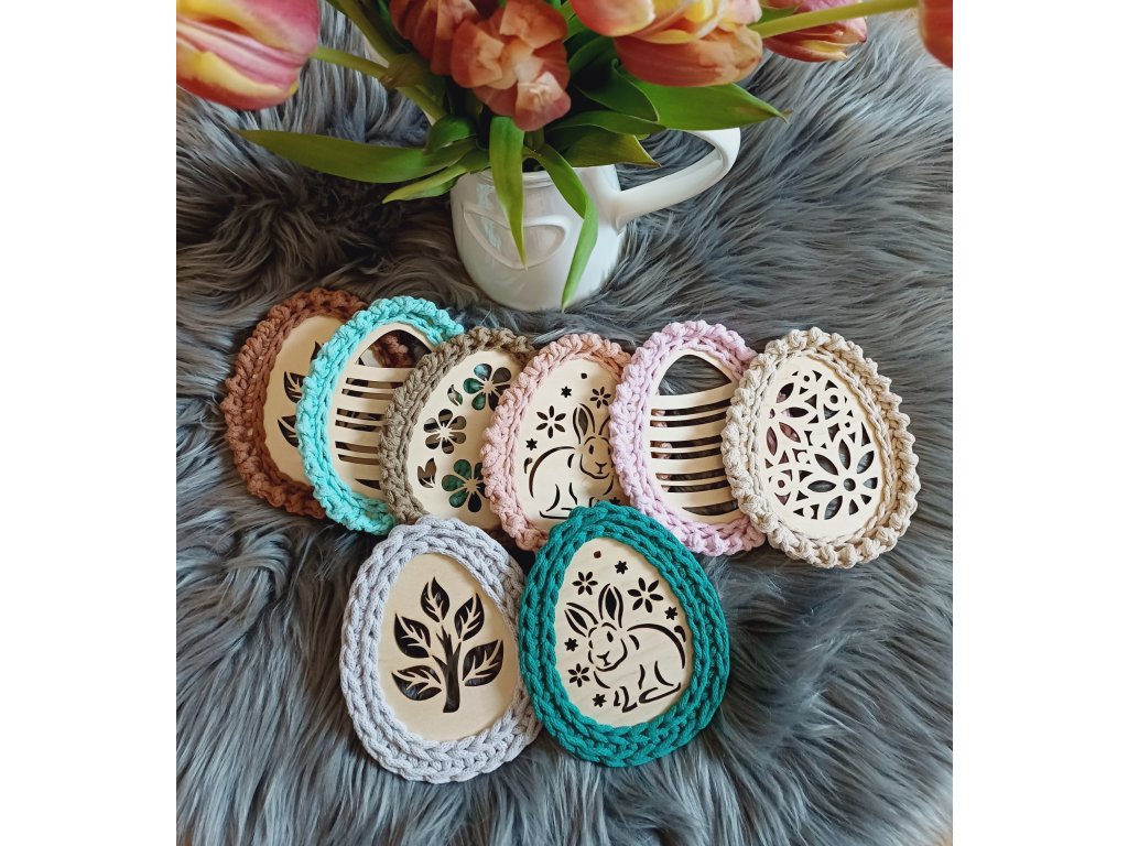 Jemná jarní dekorace, která propojuje přírodní dřevo a ruční háčkování. Každé vajíčko je originál vytvořený s důrazem na detail. Vajíčka se hodí jako velikonoční i jarní dekorace – na stůl, poličku, k zavěšení nebo jako podtácek.