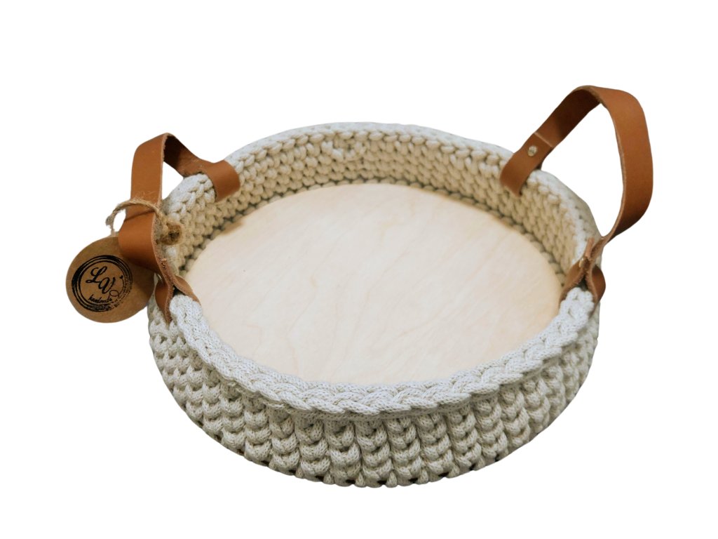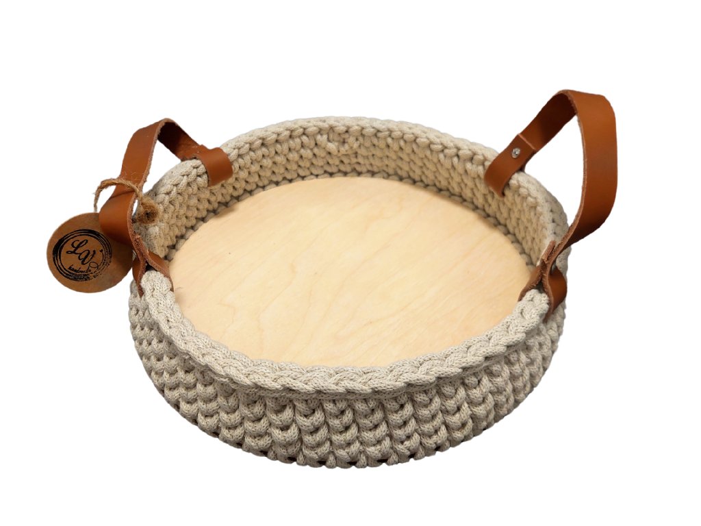 Stylový a praktický servírovací tác ručně háčkovaný z kvalitní bavlněné příze, doplněný pevným dřevěným dnem pro stabilitu. Kožená ucha zajišťují pohodlnou manipulaci a zároveň dodávají elegantní vzhled. Ideální pro servírování, dekoraci nebo organizaci drobností.