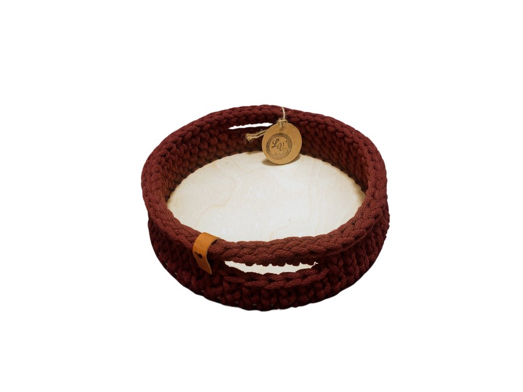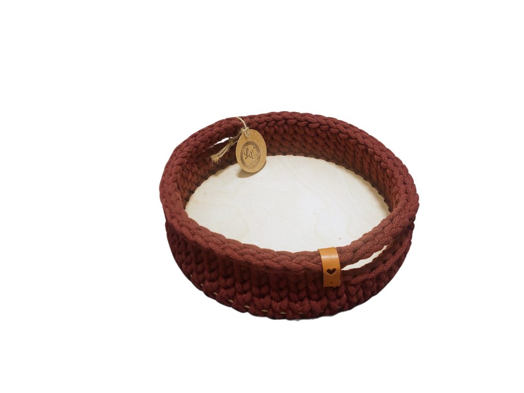 Stylový háčkovaný tác v teplém odstínu, doplněný uchy pro snadné přenášení. Ručně háčkovaný okraj dodává jedinečný vzhled, zatímco pevné dřevěné dno zajišťuje stabilitu. Vhodný pro servírování, organizaci nebo jako dekorativní doplněk do interiéru.