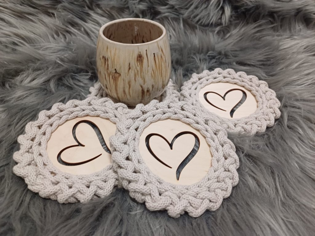 Elegantní sada čtyř podtácků kombinující překližkový základ a jemně háčkovaný lem z bavlněné příze. Každý podtácek je zdoben vyřezávaným motivem srdce, který dodává jedinečný a romantický vzhled. Praktický a dekorativní doplněk pro váš domov, který ochrání stůl a zároveň vnese do interiéru hřejivý nádech ruční práce. Dostupné v různých barevných variantách.