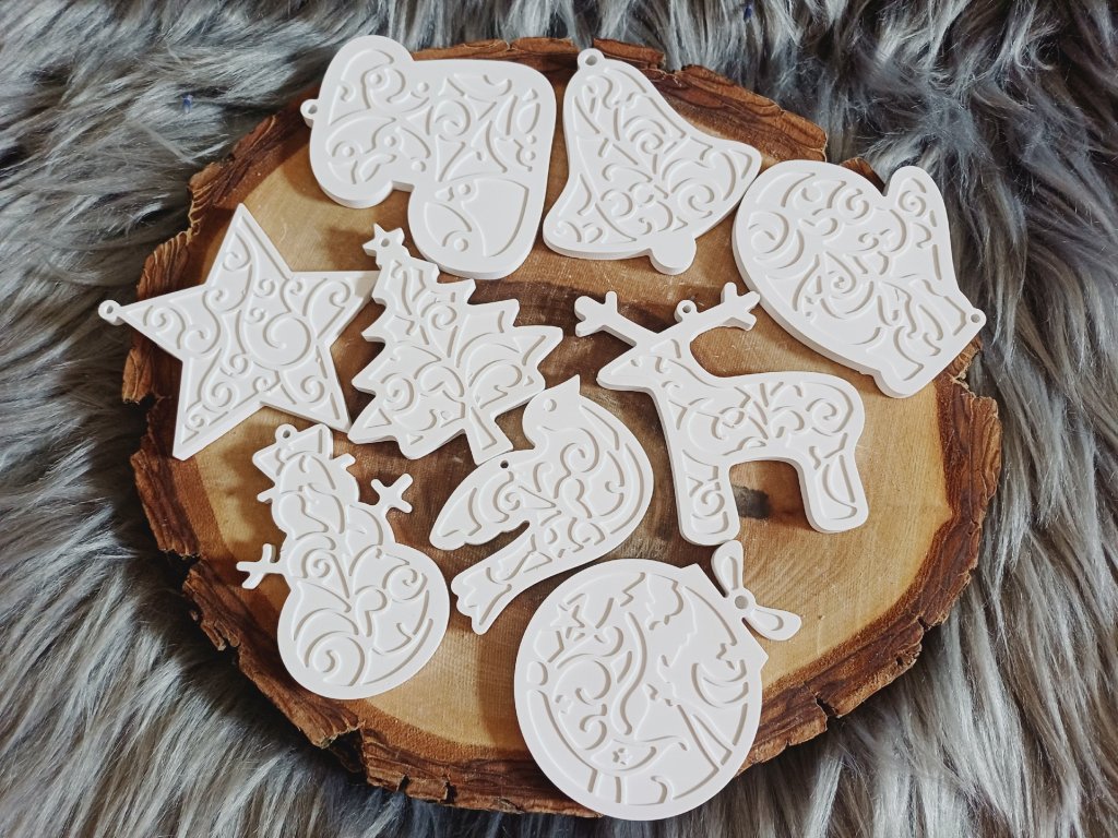 Decentní sada ručně odlévaných ozdob z keraflottu v čistě bílé barvě. Každá ozdoba je zdobená jemným reliéfem, který jí dodává jedinečný a elegantní vzhled. Díky poutku je lze snadno zavěsit na větvičku, věnec, do okna nebo na vánoční stromeček.