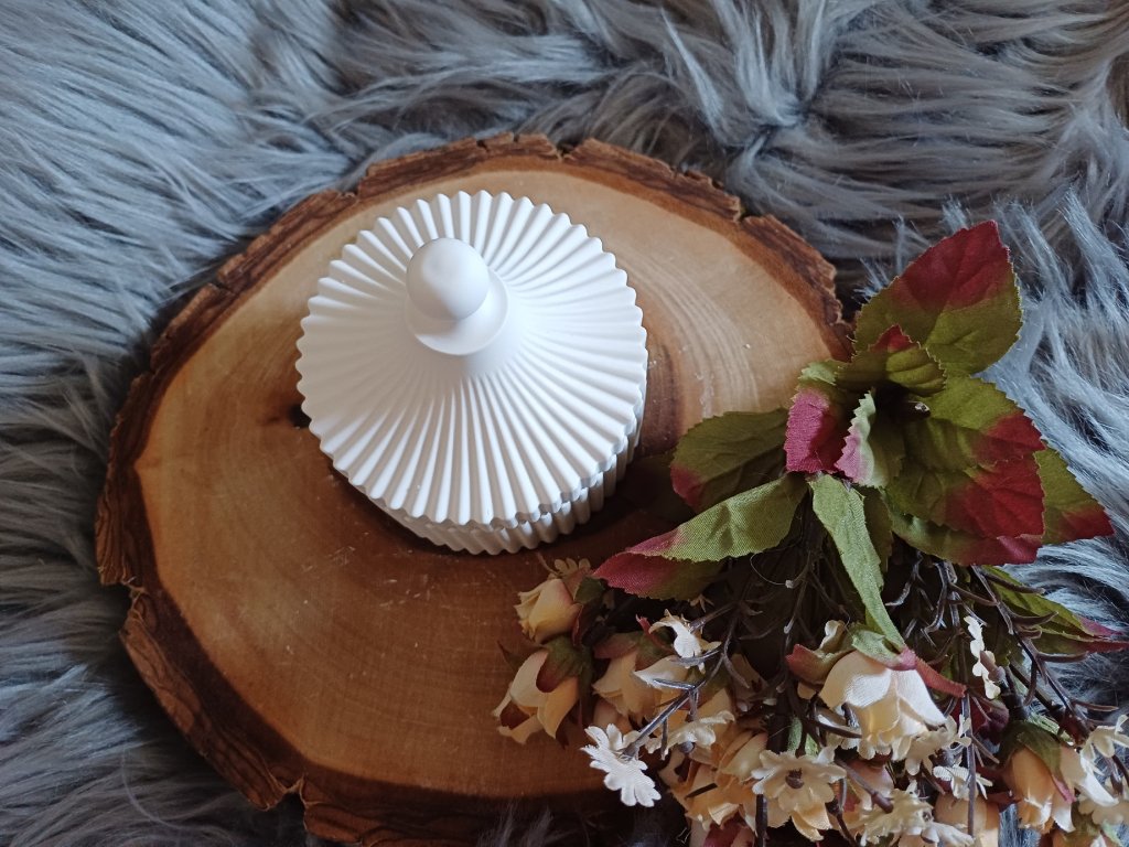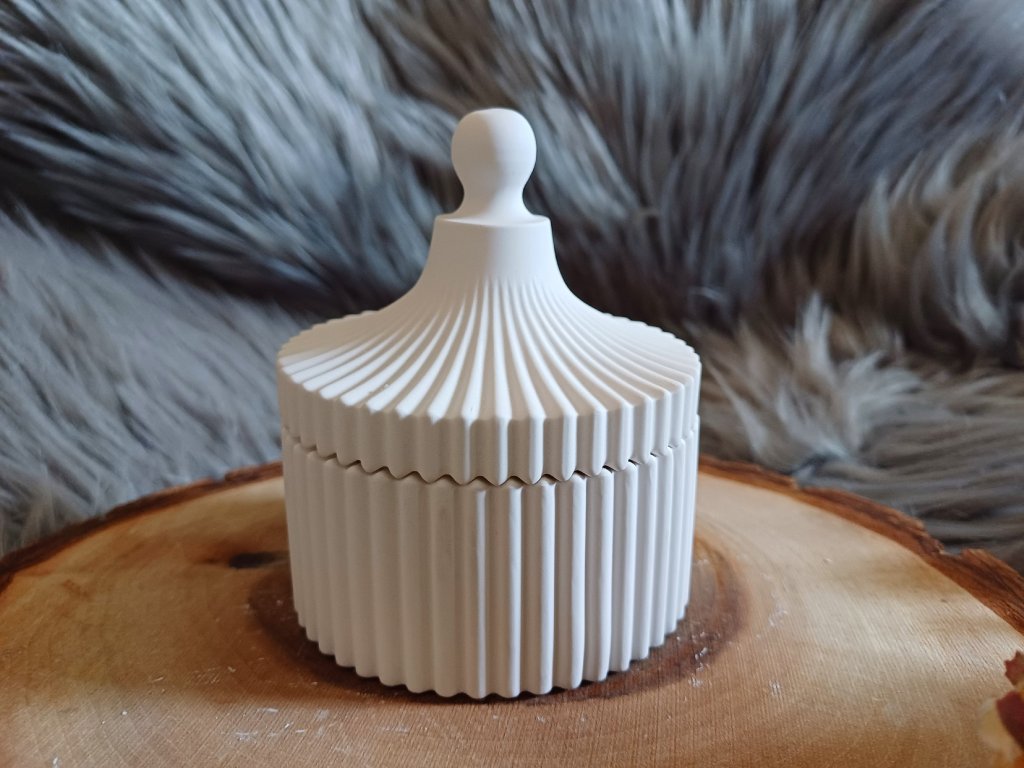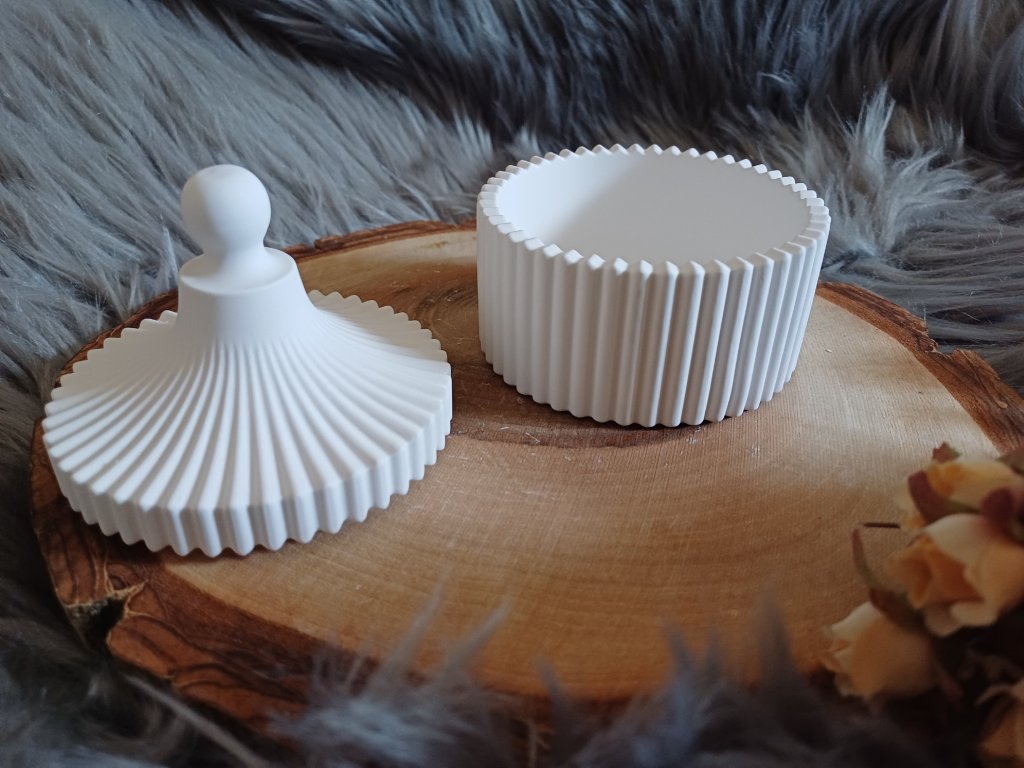 Stylová šperkovnička z keraflotu s jemným pruhovaným povrchem. Praktické víčko s kulatým úchytem a čistý design dělají z této dózy elegantní doplněk do interiéru. Vhodná na šperky, drobnosti nebo jako dekorace.