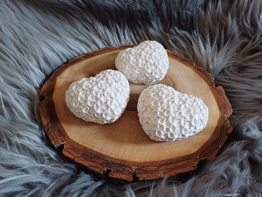 Dekorativní srdíčko vyrobené z keraflotu. Povrch je zdoben plastickými květy šeříku, které dodávají jemný a romantický vzhled. Vhodné jako ozdoba do interiéru či milý dárek.